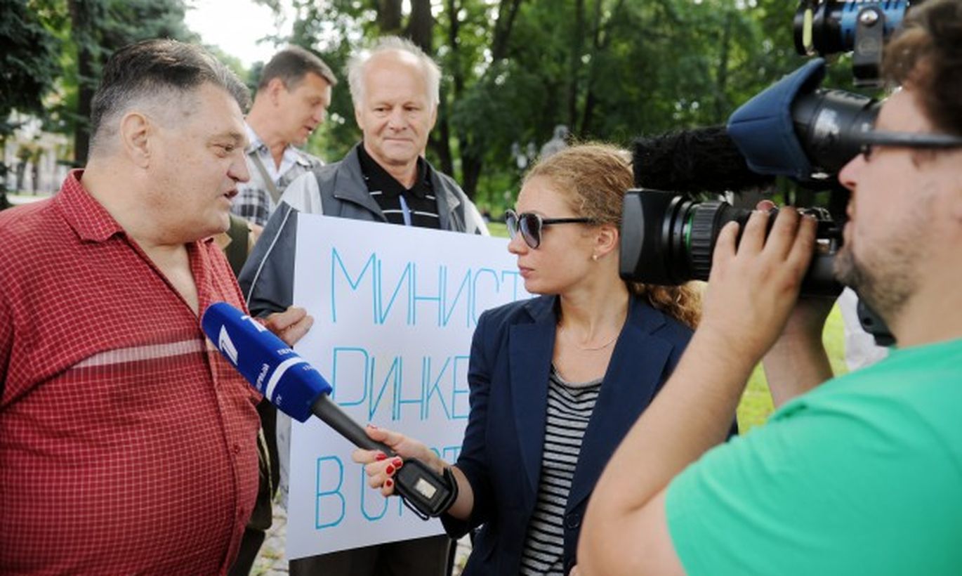 Latvijas Krievu savienības protesta akcijas pret Latvijas ārpolitiskajiem lēmumiem, kas veicinājuši sankciju ieviešanu no Krievijas puses, dalībnieki atbild uz ''Pirmā Baltijas kanāla'' žurnālistu jautājumiem